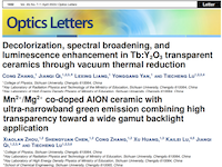 近日,研究室在《Optics Letters》期刊上发表了两篇论文,分别题为“Decolorization, spectral broadening, and luminescence enhancement in Tb:Y2O3 transparent ceramics through vacuum thermal reduction”和“Mn2+/Mg2+ co-doped AlON ceramic with ultra-narrow-band green-emitting combining high transparency toward wide gamut backlight application”。