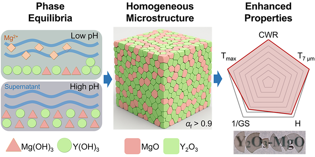 Y2O3–MgO复合材料因其优异的光学性能、机械强度和热稳定性,在中红外透明材料领域备受关注。相较于其他陶瓷材料,它具有更低的光吸收、更宽的红外透射窗口和更强的抗热震性能。其性能与微观结构密切相关:当晶粒尺寸远小于入射波长且两相分布均匀时,可显著减少相界散射,提高透光率;同时,细化晶粒能增强机械强度。因此,优化相比例、晶粒尺寸和相均匀性是提升其综合性能的关键。共沉淀法可制备高纯度、纳米级、原子级均匀的粉体,是获得高性能Y2O3–MgO复合材料的理想方法。然而,Y3+和Mg2+沉淀所需的pH值差异显著,导致二者难以同步沉淀,易引起粉体化学不均匀,进而损害烧结陶瓷的相均匀性与性能。提高共沉淀pH值可使两种离子完全沉淀,而后续的溶剂热处理可促进颗粒均匀化和结晶度提升。因此,精确控制共沉淀过程的pH值对获得理想微观结构和优异性能至关重要,但目前该参数的影响尚未得到系统研究。