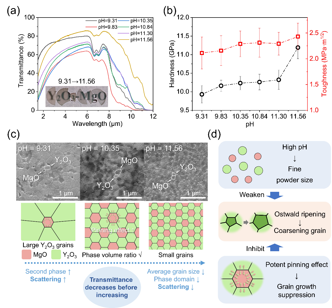 为填补这一空缺,本研究通过精确控制Y2O3-MgO纳米粉体在共沉淀-溶剂热合成过程中的pH值,成功实现了对粉体特性及最终复合材料性能的优化调控。提高合成pH值后,获得了具有近乎理想相比例、小粒径(约18纳米)、低团聚度且相分布均匀的纳米粉体。经热压烧结,制得了全致密的Y2O3-MgO复合材料,其微观结构显著改善,具备理想的相体积比、高相均匀性及细小的平均晶粒尺寸(129±4纳米)。得益于晶界钉扎、米氏散射与霍尔-佩奇机制的协同作用,该复合材料展现出卓越的综合性能:其中红外透光率尤为突出(最高达85%,7 µm处为79%,截止波长覆盖1.0–11.5µm,接近理论极限且为目前报道最高),同时兼具高硬度(11.19 GPa)和断裂韧性(2.43 MPa·m1/2)。此项研究不仅为中红外透明Y2O3-MgO复合材料提供了新见解,更确立了一种通用策略:通过调控前驱体pH值来控制纳米粉体的化学与形貌,从而为极端环境定制高性能多晶材料。